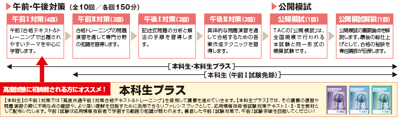 - 科目A-1対策では『パーフェクトマスター共通午前I』を使用してポイント講義を進めていきます。「本科生プラス」では、その講義の復習や問題演習の際に不明な点の確認や、より深い理解を目指すために活用できるリファレンスブックとして、『応用情報技術者試験対策テキストI・Ⅱ・Ⅲ』を配付いたします(自己学習用)。科目A-1試験は応用情報技術者試験で学習する範囲が問われます。徹底した対策で、科目A-1試験突破を目指してください。