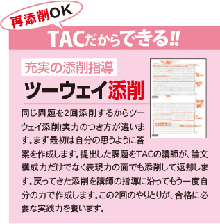 まず最初は自分の思うように答案を作成します。提出した課題をTACの講師が、論文構成力だけでなく表現力の面でも添削して返却します。戻ってきた添削を講師の指導に沿ってもう一度自分の力で作成します。この2回のやりとりが合格に必要な実践力を養います。