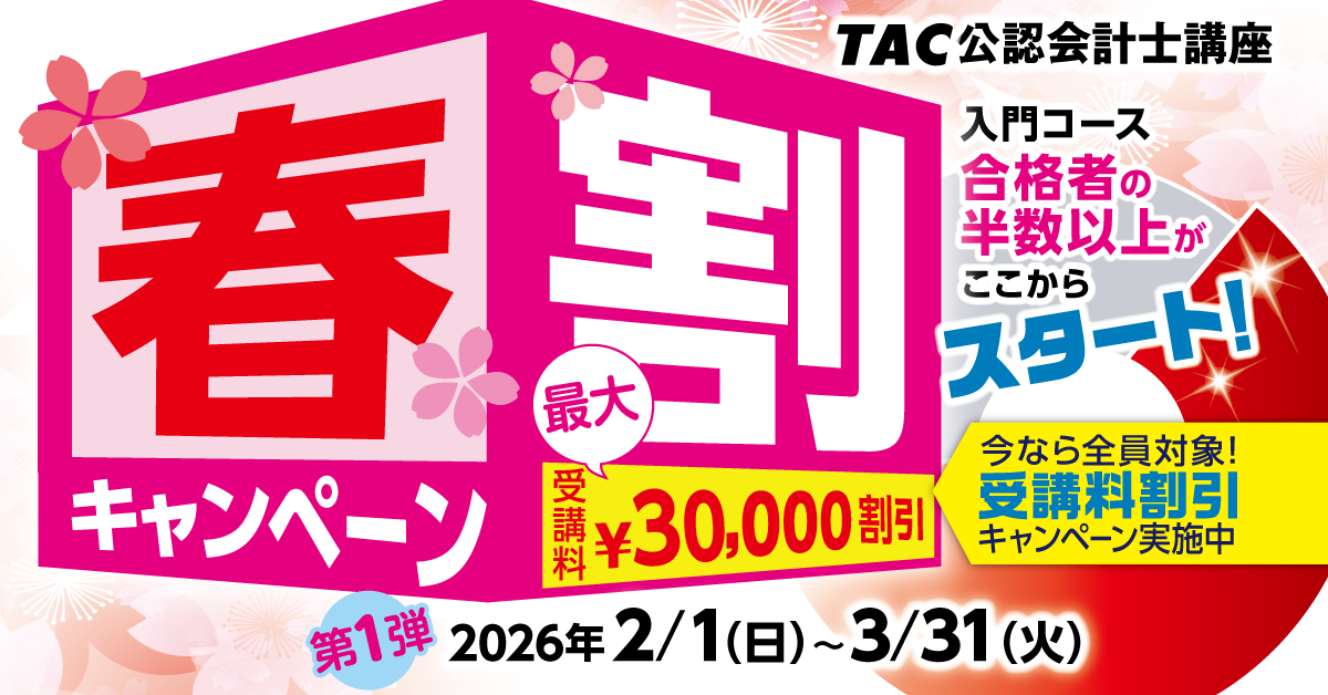 - 春割キャンペーンは、TAC 取扱代理店(大学生協・書店等)割引・NEXT 割引・日商簿記ステップアップ割引・株主優待割引券・法人割引等のいずれか1つとの併用が可能です。