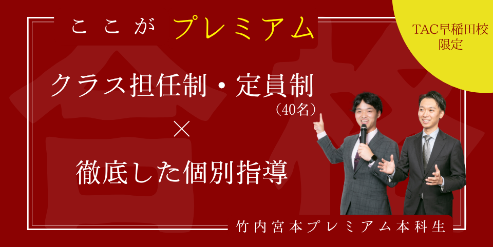 「竹内・宮本プレミアム本科生」はTAC早稲田校のみのお取り扱いとなります。e受付・郵送申込・他の校舎でのお申込みはできません。