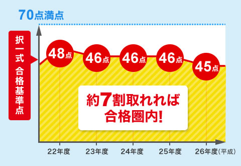 社会保険労務士試験は択一式と選択式の2つの形式で出題され(マークシート形式)、それぞれ合格基準点を満たした受験生が合格となります。合格基準点は毎年変わりますが、総合得点はおおむね7割程度以上得点することが必要です。