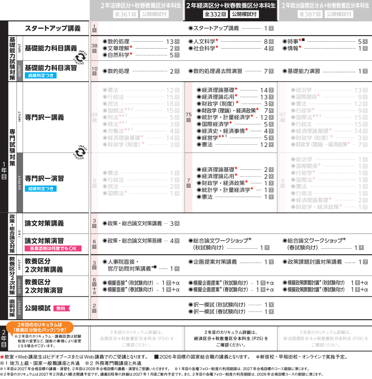 主要科目の2回転学習で、約2年の時間をかけてより確実に最終合格・内定を目指せる、大学2年生用のスペシャルコースです。1年目は教養区分対策を中心としつつ、専門科目の基礎を先取り学習し、2年目は1年目の学習内容の2回転目&応用・演習中心の学習で総合的かつ万全の対策を行います。大学2・3年次に受験可能な教養区分対策にもしっかりと時間をかけることができますので、より確実に国家総合職試験の最終合格&内定を目指すことが可能です。