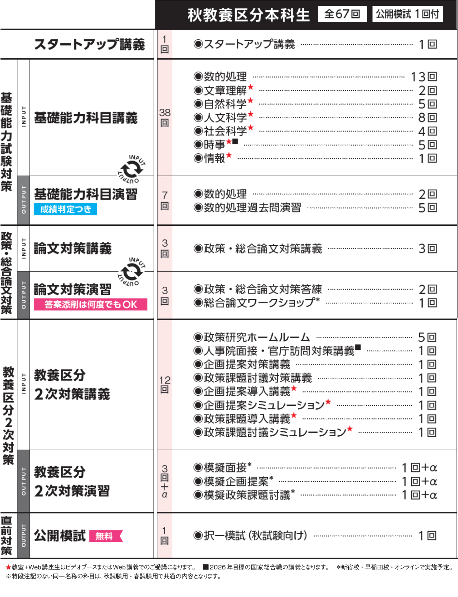 基礎能力試験、総合論文試験、企画提案試験、政策課題討議試験、人事院面接、官庁訪問の各対策について基礎から学習、対策できます。教養区分特有のコミュニケーション能力や政策立案に関する思考力についてもカリキュラムの中で身につく教養区分対策に特化したオリジナルコースです。