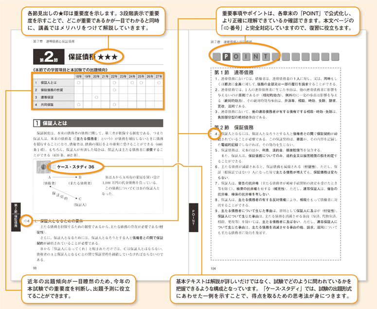 講義をおこなう際に使用するインプット用の教材が基本テキストです。この教材は、各章ごとに「学習項目」→「解説」→「POINT」の構成になっていますので、「問題提起」→「理解」→「記憶」へと体系的に学習することができます。