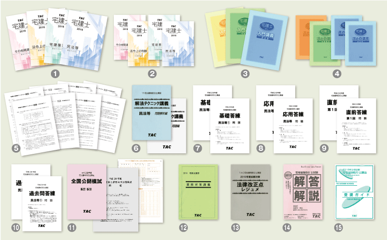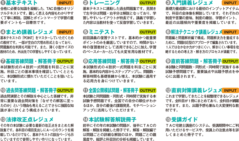 本試験の出題傾向を徹底的に分析し、合格に必要な要素を抽出。 さらに受講生アンケートをもとに、少しでも分かりやすい内容になるよう毎年改訂をおこなっています。 もちろん法改正にも対応。合格に必要な要素だけに内容を絞った『TACオリジナル教材』は、短期合格に必須のツールです。