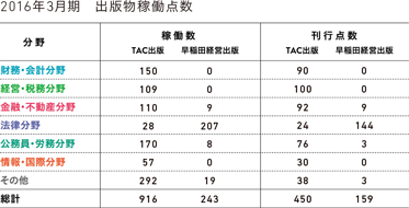 TAC出版と早稲田経営出版を合算すると、著名な出版社とともに、11位相当の売上規模があり、資格書籍を主力とする出版社としては有数の規模を誇っております。