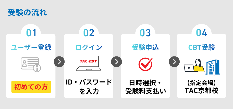 初めてTAC-CBTで受験される方は、ログインIDとパスワードの取得が必要です。まずはユーザー登録を行ってください。「受験者マイページ」が作られ、申込・変更等の手続きが行えます。