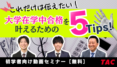 大学在学中に見事一発合格を勝ち取った合格者が、大学との両立の工夫や学習の進め方など「これだけは伝えたい!」という5つの秘訣を語ります!限られた時間で最大の力を発揮するために、是非参考にしてみてください!