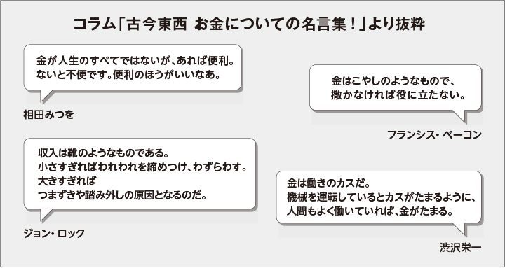 萌さん あと税金や社会保障の話があったり、お小遣いを計画的に使う方法のレクチャー、そして各章の最後に名言集もついているわよ。