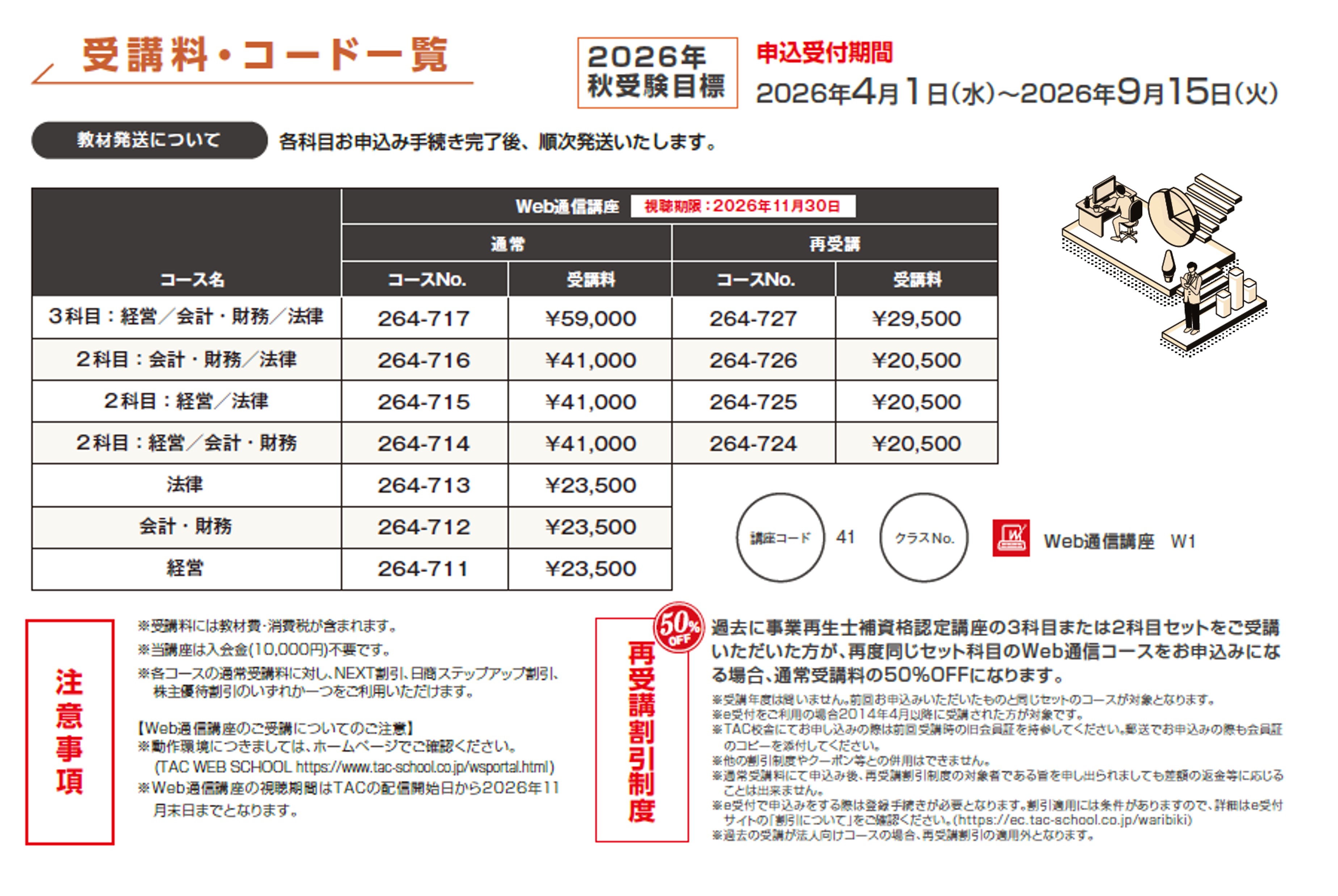 過去に事業再生士補資格認定講座の3科目または2科目セットをご受講いただいた方が、再度同じセット科目のWeb通信コースをお申込みになる場合、通常受講料の50%OFFでご受講いただける制度です。