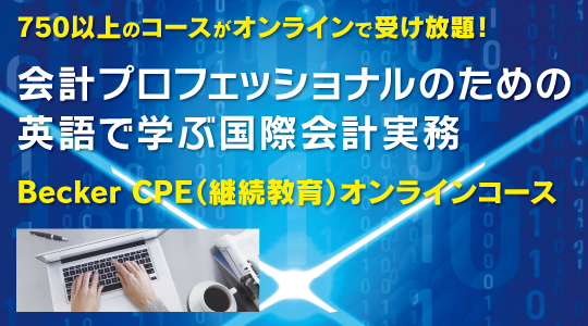 最新の国際会計実務に関する750以上の講義(英語)が1年間の受講期間中いつでもPC、スマホ、タブレットで受け放題でUSCPA等の国際会計資格のライセンス更新に必要な継続教育 (CPE) の単位がオンラインで取得できるコースです。最新の国際会計実務に関する知識をBeckerのエキスパート講師陣による英語の講義で身に付け、実務の現場でお役立てください。