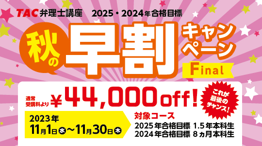 TACは目標年度に合わせた「短答+論文」合格を可能にするカリキュラムにこだわっています。広範囲に渡る学習範囲を効率的に学習できるようポイントを押さえ、TACのカリキュラム通りに学習すれば、自然と合格するための実力がつくよう、ムリ・ムダのないカリキュラムになっています。また、論文式の範囲は短答式の試験範囲の中から出題されることを踏まえ、短答式と論文式の学習を同時に進める効率的なカリキュラムを実現していますので、合格目標年度に合わせた短答と論文の学習をすることができます。