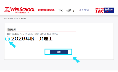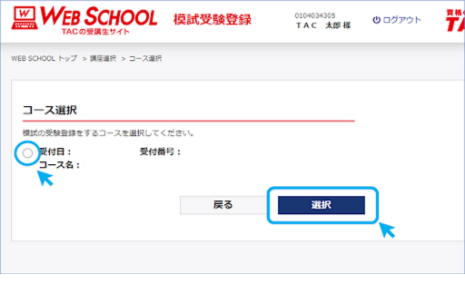 サイトへ遷移したら、模試の登録を行う「講座」「コース」にチェックを入れ、”選択”をクリックしてください。