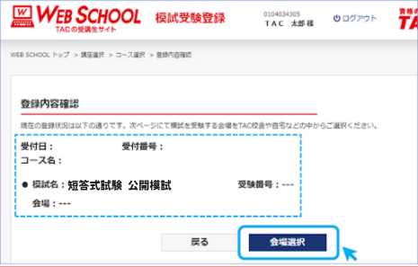 登録を行う模試をご確認いただきましたら、画面下部にある”会場選択”をクリックしてください。