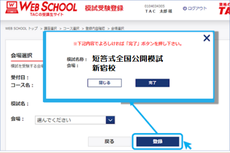 △受験会場を選択したら、“登録”→“完了”とクリック。