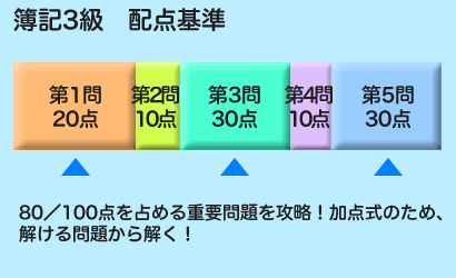 簿記3級試験は全5問出題され(記述式)、各配点は、第1問20点、第2問10点、第3問30点、第4問10点、第5問30点です。 このうち配点の大きい第1問:仕訳、第3問:試算表、第5問:精算表・財務諸表の作成が得点源となります。繰り返し学習をして、ココを得点できれば合格基準はクリアです。