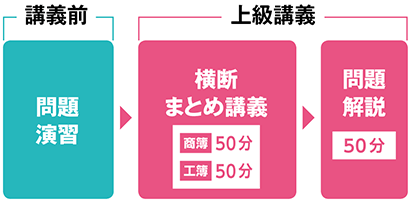 【2級上級講義】 ……『合格テキスト』を使って、毎回、商簿、工簿の各「論点」をいくつか挙げてポイント解説をするまとめの講義=「ピックアップ講義」という形式をとっています。その講義で扱った論点の問題を『網羅型完全予習問題集』を使い、実際に解き、解説していきます。解説講義では、また『合格テキスト』を振り返り、論点を再度確認し、別の問われ方をした場合を想定した解き方なども行います。
