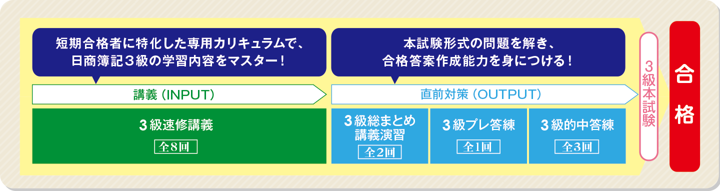 【3級総まとめ講義演習・3級プレ答練・3級的中答練】 ……これまで学習した内容の総まとめ→問題を解くトレーニング→本試験予想問題を解く、の段階的アウトプットにより、知識を合格答案に反映させるスキルの習得を目指します。