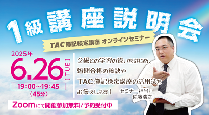 簿記1級合格を目指す方を対象としたセミナーです。簿記1級って実際どのようなことを学習するの?1級を取得したらどんなメリットがあるの?などを人気講師が約60分で分かりやすくお話します。終了後にはテキスト形式でのご質問も承ります。
