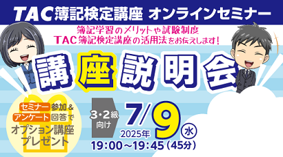 簿記のネット試験、どこで受ける?TACで受けよう! 簿記を学習中の皆さん、TACで本番のネット試験を受験できるって知ってましたか?今回のイベントは、簿記検定の講座説明会に加え、実際のネット試験会場まで見学できるまたとないチャンスです!ご参加いただいた方には、人気のオプション講座「ネット試験対策セミナー」と「本試験過去問集」をプレゼント!簿記を勉強中の方も、これから勉強しようとお考えの方も、奮ってご参加ください! ※参加無料/予約不要 |