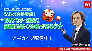 TACでは法律初心者に効率性の観点から3・2級同時学習を推奨していますが、その学習にかかる負担や2級までの合格の必要性を気にされる方も少なからずいらっしゃいます。そこで本セミナーでは、2級対策講座担当の田畑講師が、TACで高い合格率を実現できている理由と、確実に3・2級合格するための効率的学習法についてお話しします。