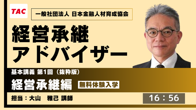 経営承継アドバイザー「経営承継編」基本講義 第1回(抜粋版)[24-25年度版]です。プロ講師のわかりやすい講義・使いやすいTACオリジナル教材など…一度体験してみてください!