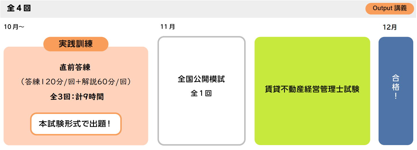 アウトプット4回(直前答練3回・全国公開模試1回)で、直前期に合格に必要な知識を整理し、実践訓練で本試験に備えます。