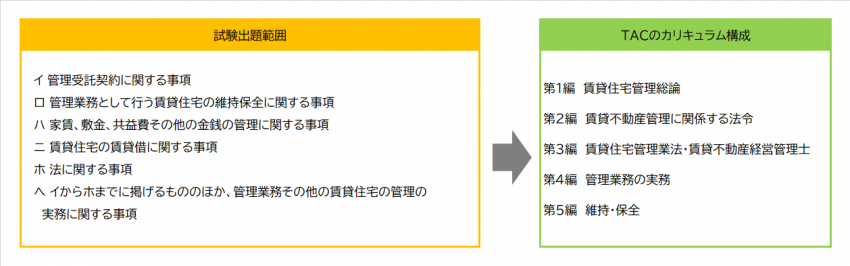 試験実施団体が試験用学習教材として出している書籍「賃貸不動産管理の知識と実務」は掲載項目が膨大です。多岐にわたる出題範囲を、得点の勘どころを掴まないままやるのは、時間と労力の浪費です。やみくもに教材を通読するよりも、組み合わせて理解したほうが早い項目もあり、TACでは、試験範囲を学習効率に配慮した5項目に編成し直したカリキュラムで学習します。
