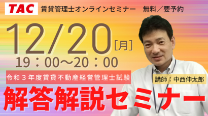 2025年賃貸不動産経営管理士試験の正答予想をもとに、重要論点や合否を分けそうな問題を解説するオンラインセミナーです。TACデータリサーチ結果をもとにした本試験分析もおこないます。今年受験された方も、来年受験予定の方も是非ご参加ください!(参加無料・要予約)