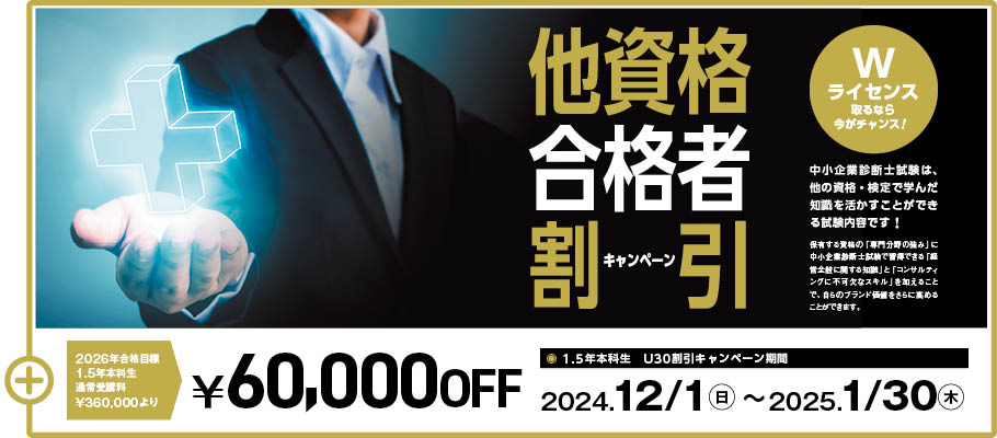 他資格合格者割引キャンペーン期間中(12/1(月)~ 2026.1/31(土))に「2027年合格目標 1.5年本科生」をお申込みされると、通常受講料より¥50,000 OFFでお申込みいただけます。