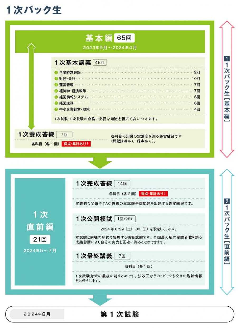 1次パック生は、「1・2次ストレート本科生」のカリキュラムの一部を各科目を単科で受講することができるコースです。「1・2次ストレート本科生」の詳細は下記よりご参照ください。