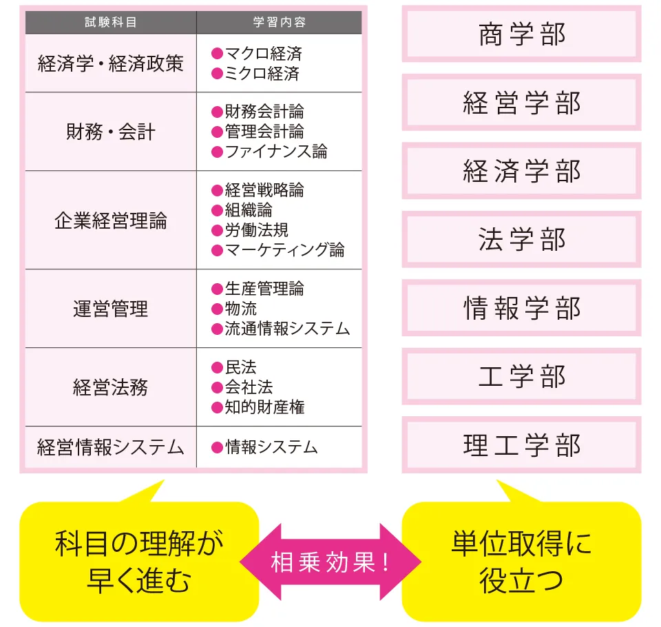 中小企業診断士試験で学習する内容は、大学の学部によっては履修科目とリンクします。馴染みのある内容を学習することで試験科目の理解も速く進み、また、大学の単位取得にも役立ち、学生にとって学習効果が高い「一石二鳥」の資格といえます。