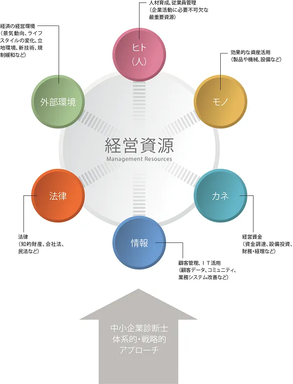 経営資源とは会社が利用できる資産のことであり、ヒト・モノ・カネ・情報・法律・外部環境の6つの項目を指します。これらの経営資源をその時の会社の経営状態によって適切に配分することで、より効率の良い経営を行えます。そのため経営者はこれらの経営資源を注意深くマネジメントする必要があります。