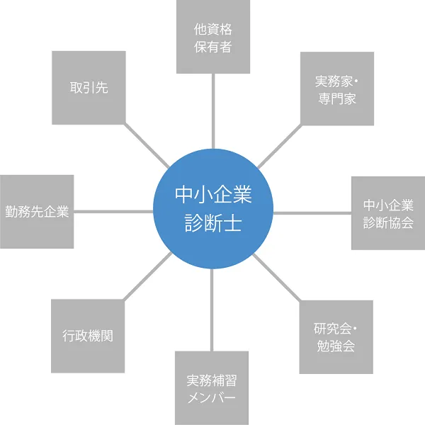 中小企業診断士のバックグラウンド(職業・経歴)は 実に多彩で、受験生時代はもちろん、試験合格後も 中小企業診断協会や研究会・勉強会での活動により 人脈がさらに広がり、新しい世界を手に入れること ができます。 そのネットワークを活かして、企業外では、クライア ントと税理士や社会保険労務士などの特定の領域 に特化するスペシャリストや行政機関との間を取り 持つコーディネーター役として、また、企業内におい ては、各部署・事業の間をつなぐパイプ役としてなど、 活躍の場が大きく広がります。