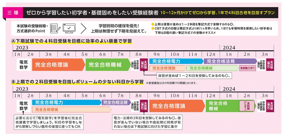 ■印は「理論」から、▲印は「電力」から、●印は「法規」からの開講となります。