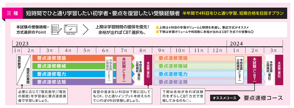 25上期用&下期用の全2回、それぞれ4科目の受験権利付きなので『上期は力試し、下期は本気で受験』や『上期は電力と法規だけ、下期は残りの科目』など、学習のペースや受験計画に合わせて活用いただけます。