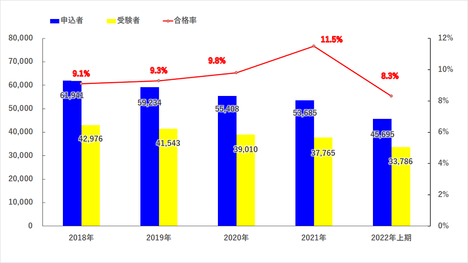 | 年度 | 受験者(人) | 合格者(人) | 合格率 |