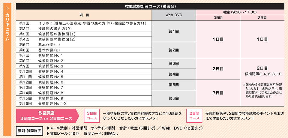 - 技能3日間コースでは、公表される全10問の課題にじっくり取り組んでいただきます。一種を初めて受験される方・実務未経験の方などじっくり取り組みたい方は3日間コースがオススメです。
