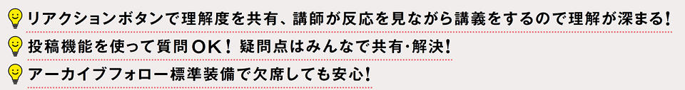 聴いただけます。コメント欄などオンラインライブ講義の様子を可能な限り再現していますので、クラスメイトの疑問点や理解度も確認しながら視聴することができます。