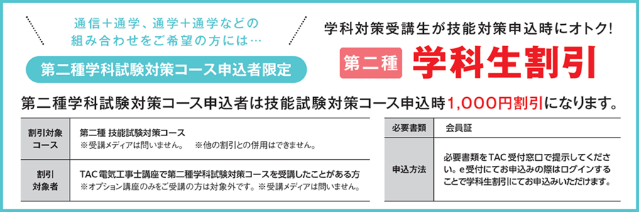 第二種 学科試験(CBT/筆記)対策コースをお申込みの方が、技能試験対策コースをお申込みの際は1,000円割引になります!
