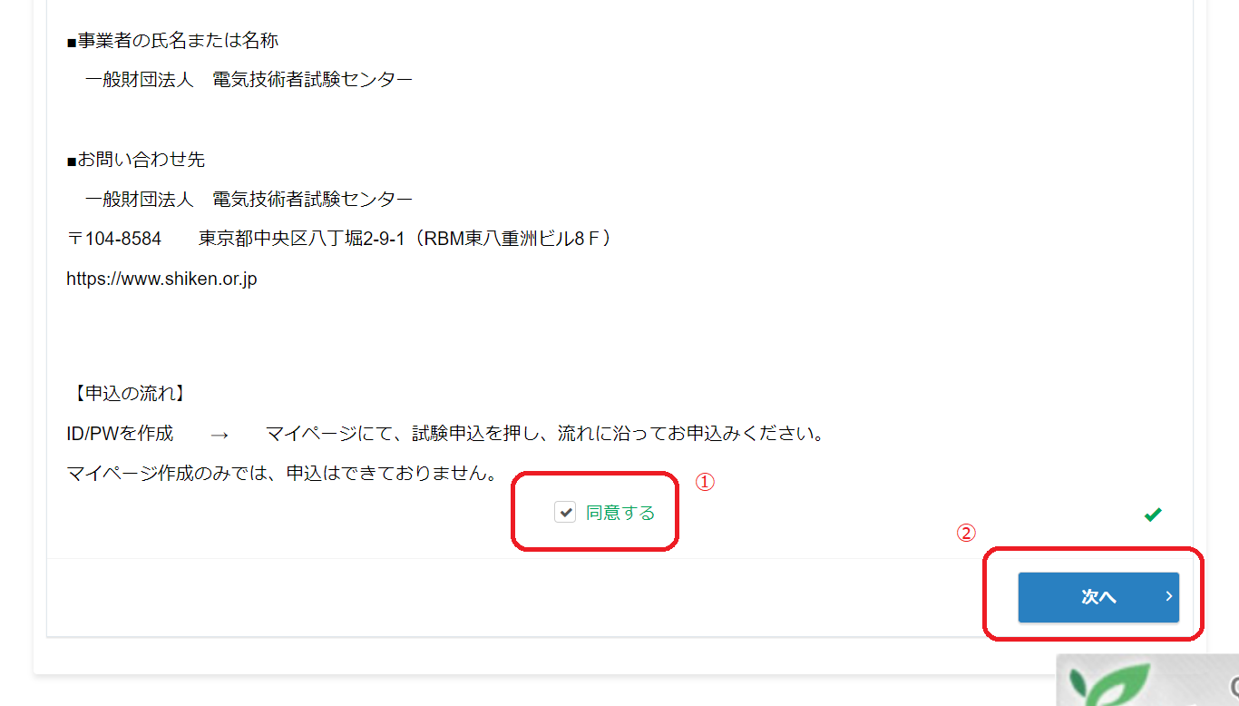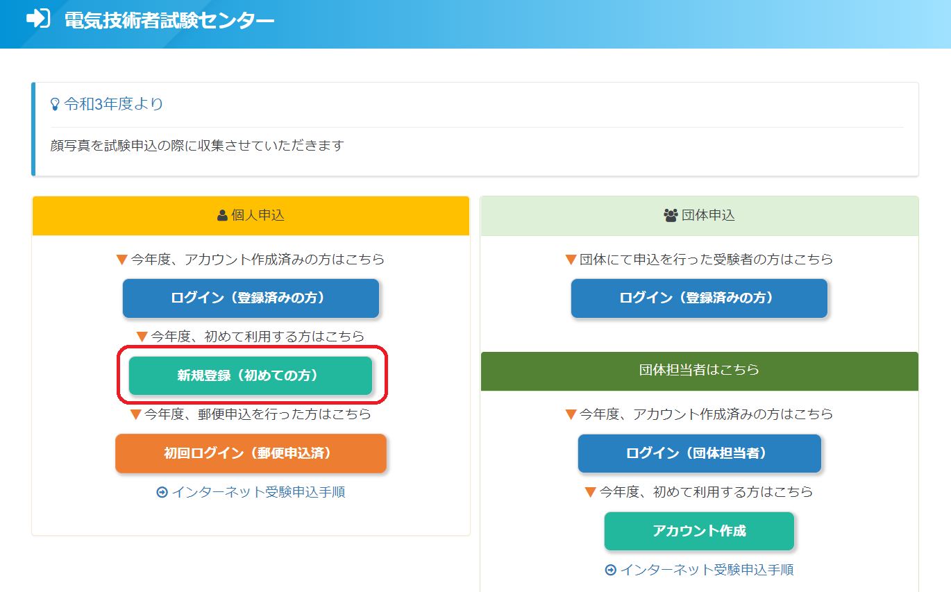 一般財団法人電気技術者センターのHPへアクセスします。まずはマイページ登録をしましょう。以下の画面が表示されたら、個人申込へ進みます。