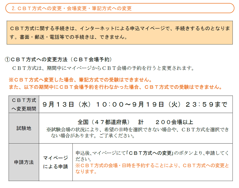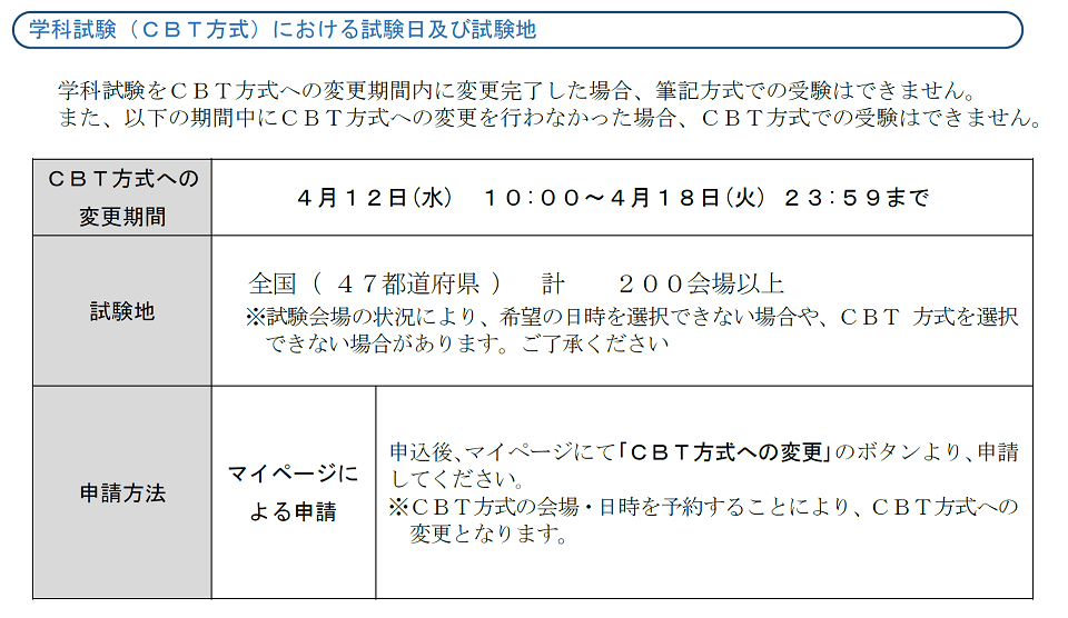 - CBT方式:所定の期間内に受験場所、試験時間を選択・変更することが可能です。