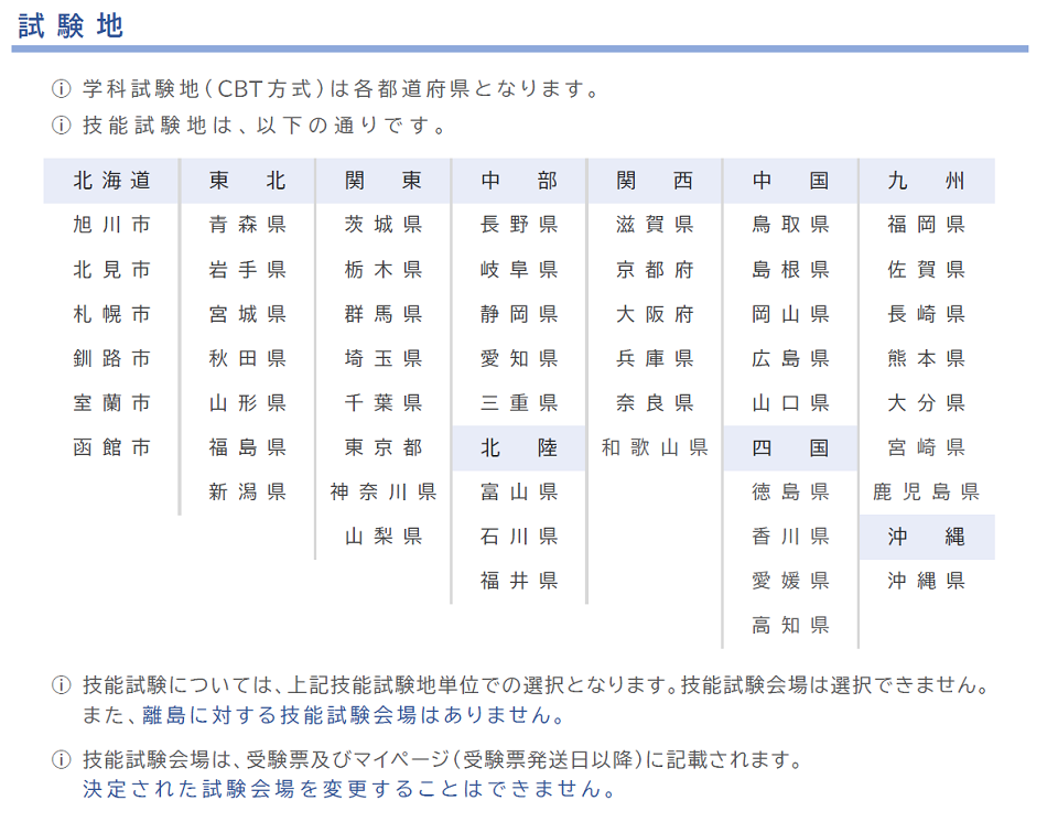 | 下期試験 | 2026年8月17日(月)~9月3日(木) | 【学科試験:CBT方式※1】2026年9月24日(木)~11月8日(日) 【学科試験:筆記方式※2】2026年10月25日(日) 【技能試験※3】2026年12月12日(土)または12月13日(日) |