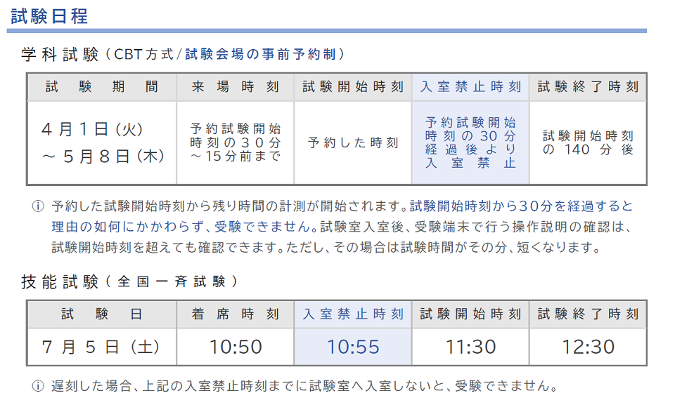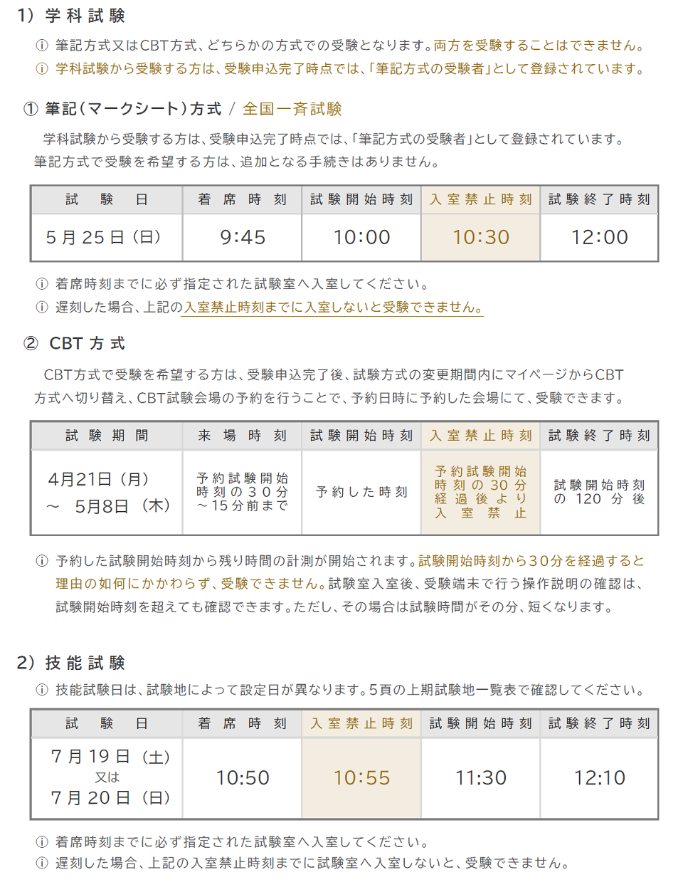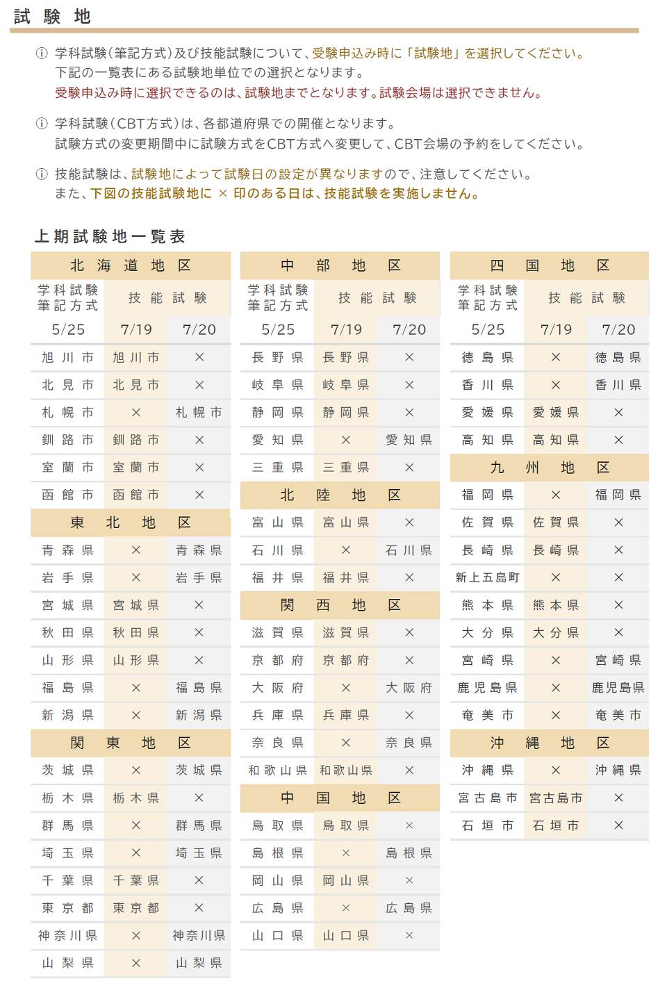 | 上期試験 | 2026年3月16日(月)~4月6日(月) | 【学科試験:CBT方式※1】2026年4月23日(木)~6月7日(日) 【学科試験:筆記方式※2】2026年5月24日(日) 【技能試験※3】2026年7月18日(土)または7月19日(日) |