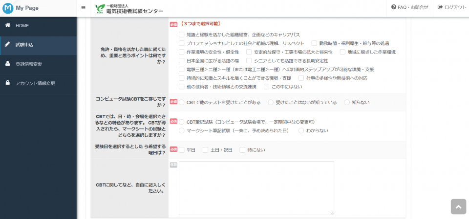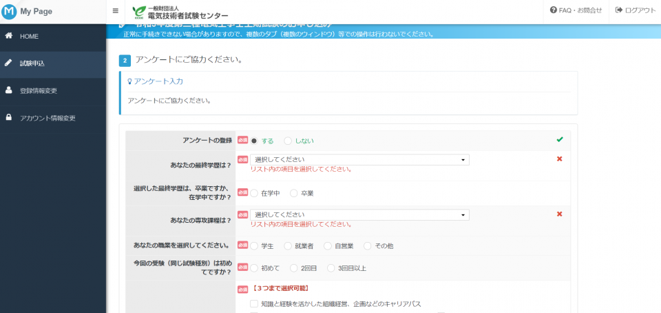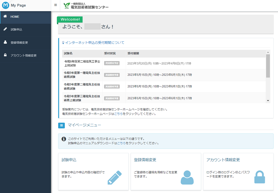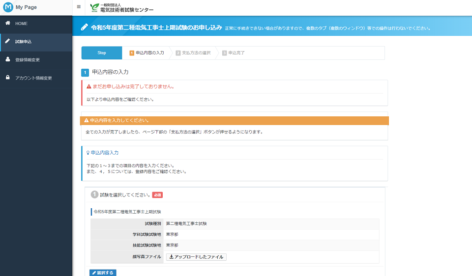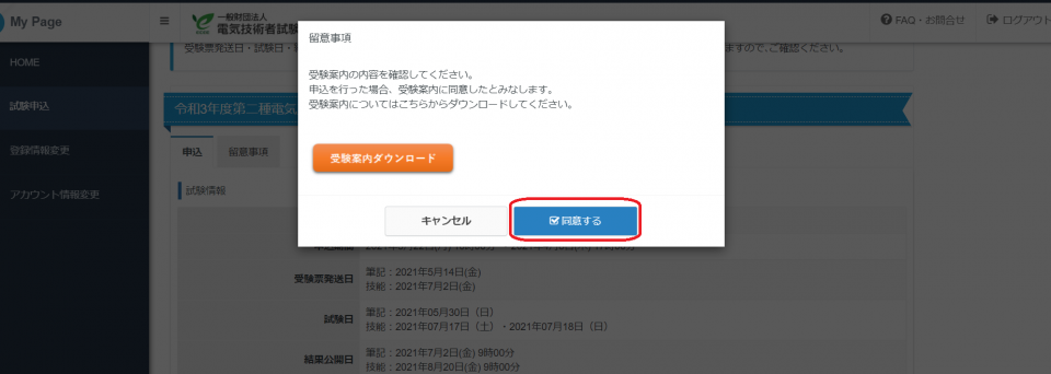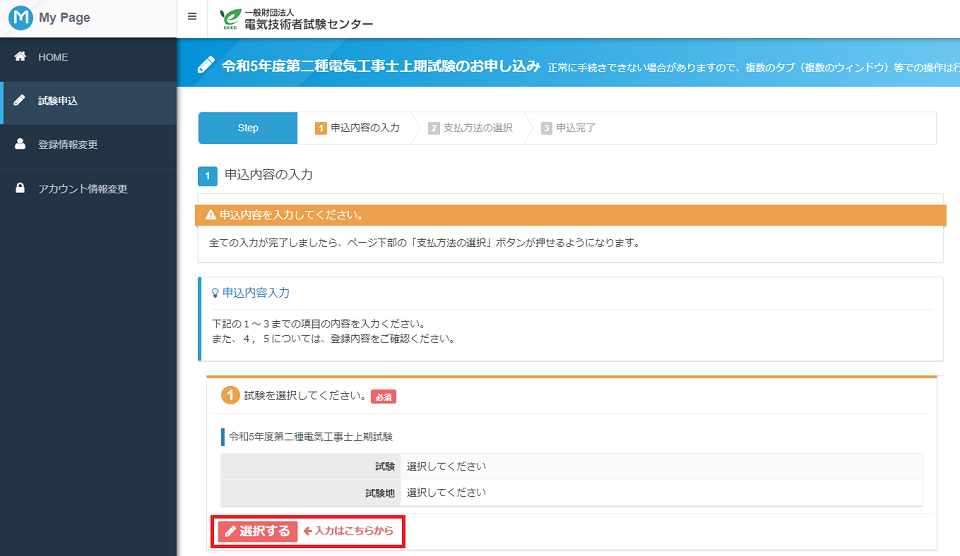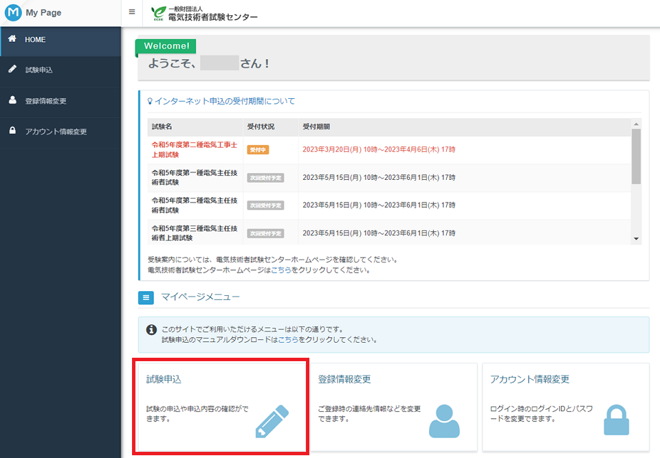 「試験申込」をクリックします。マイページでは他の試験も一覧で表示されますので、一覧から「第二種電気工事士試験申込」を探してクリックします。
