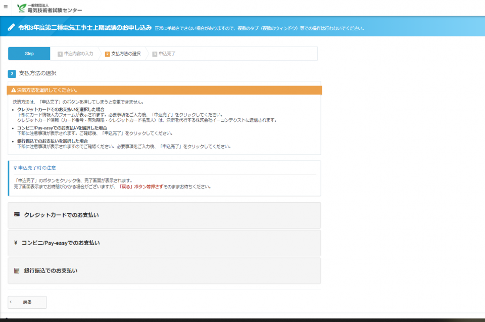 第二種電気工事士の申込み画面に来たら、「試験名」等を確認し、「お申し込み」ボタンをクリックします。
