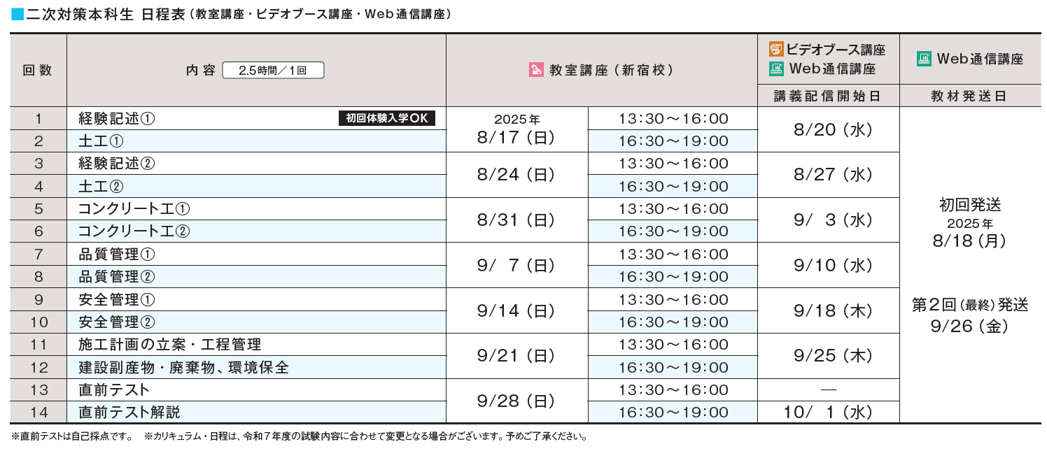 一次合格発表後すぐに始まるコースです。演習を豊富に取り入れ即時チェックしながら学習を進めていきます。肝心の経験記述は、出題が予想される3テーマについて詳しく解説+添削指導を実施します。今年度から再添削サービスも追加!さらに安心して本試験を迎えていただけるようになりました。