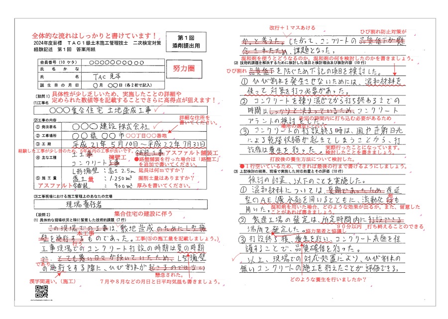 経験記述は、令和6年度試験から出題傾向が変わり、暗記だけでは難しい試験となりました。テキストに掲載の解答例をよむ→自分の経験を整理して正しい用語・正しい文章で書いてみる→添削を受ける→考えて修正する→再添削を受けるの5ステップで本質的に理解することを目指しましょう。
