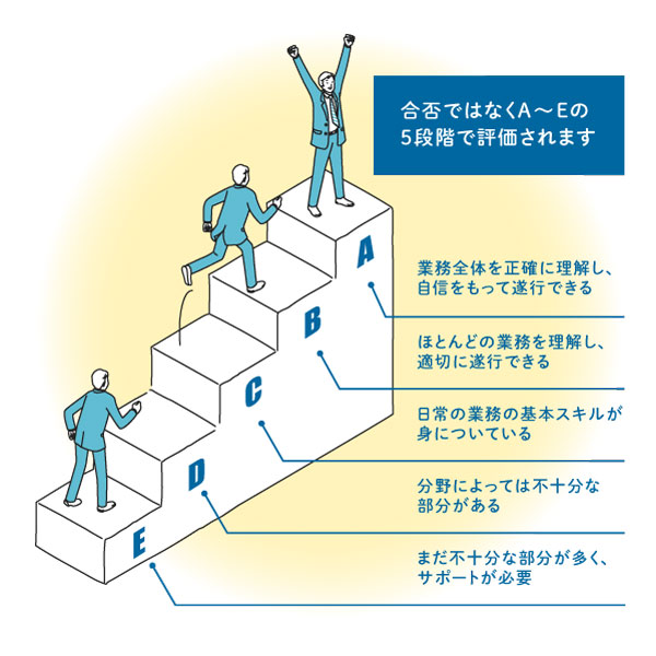 合否ではなく、A~Eの5段階で評価が行われるので、身につけた実務スキルを客観的に把握する「ものさし」として、自分に合ったスキルアップ目標を明確にすることができます。