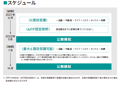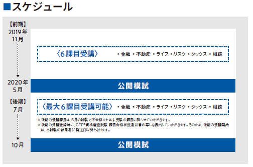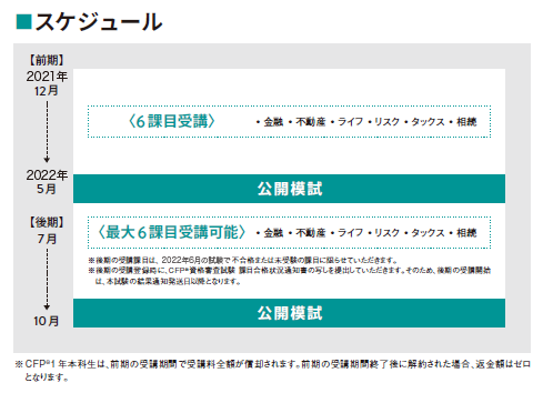 後期(2026年11月合格目標)の受講課目は、2026年6月試験で不合格または未受験の課目に限ります。後期の受講登録時に、「CFP資格審査試験課目合格通知書の写し」をご提出いただきます。そのため、後期の受講開始は、本試験の結果通知書発送日以降となります。